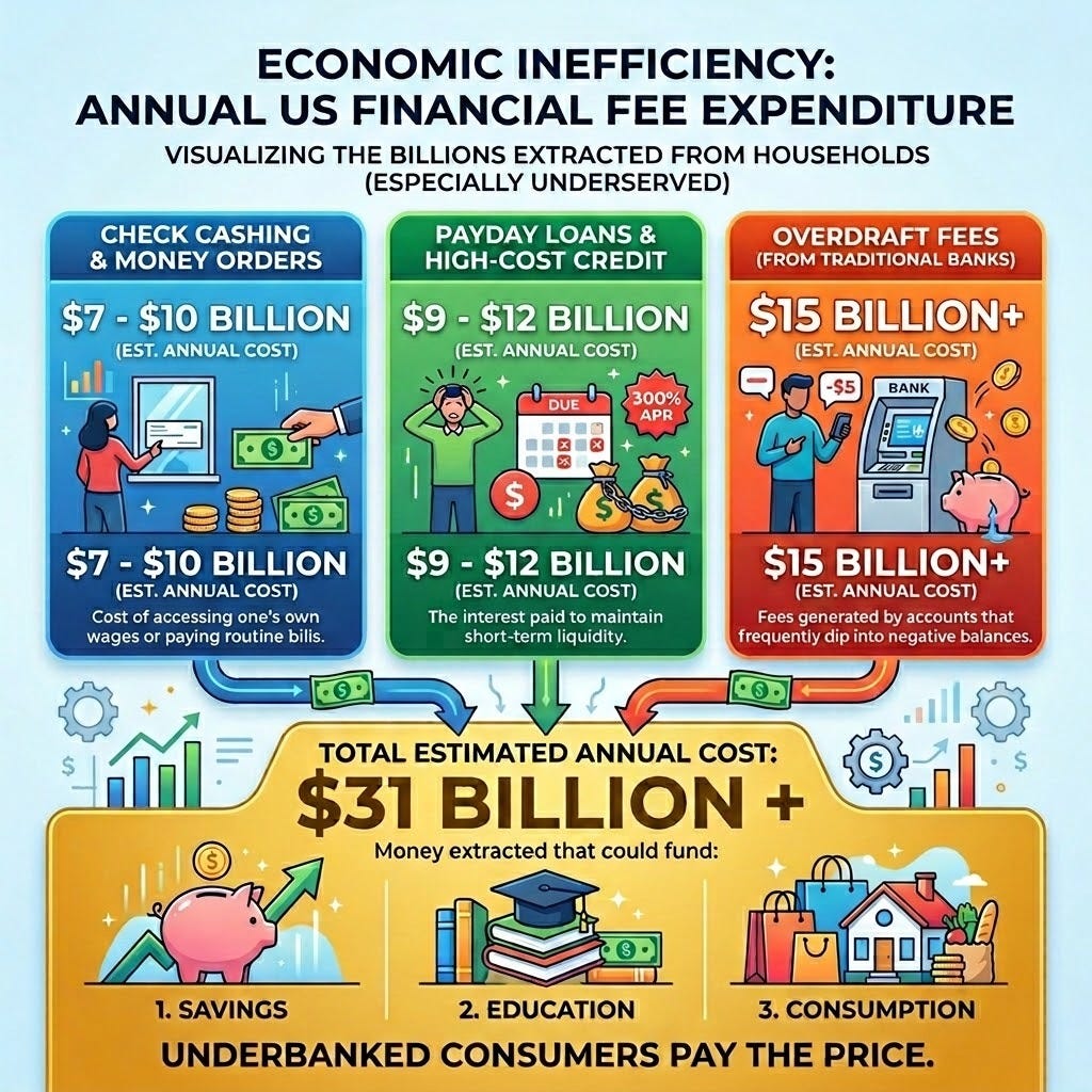 The underbanked in the US are the largest, most critical, and most financially exploited market in the nation. This community, consisting of 63 million adults with $250 billion in spending power, is currently subsidizing the profits of a predatory industry, suffering $31 billion+ in punitive fees annually.