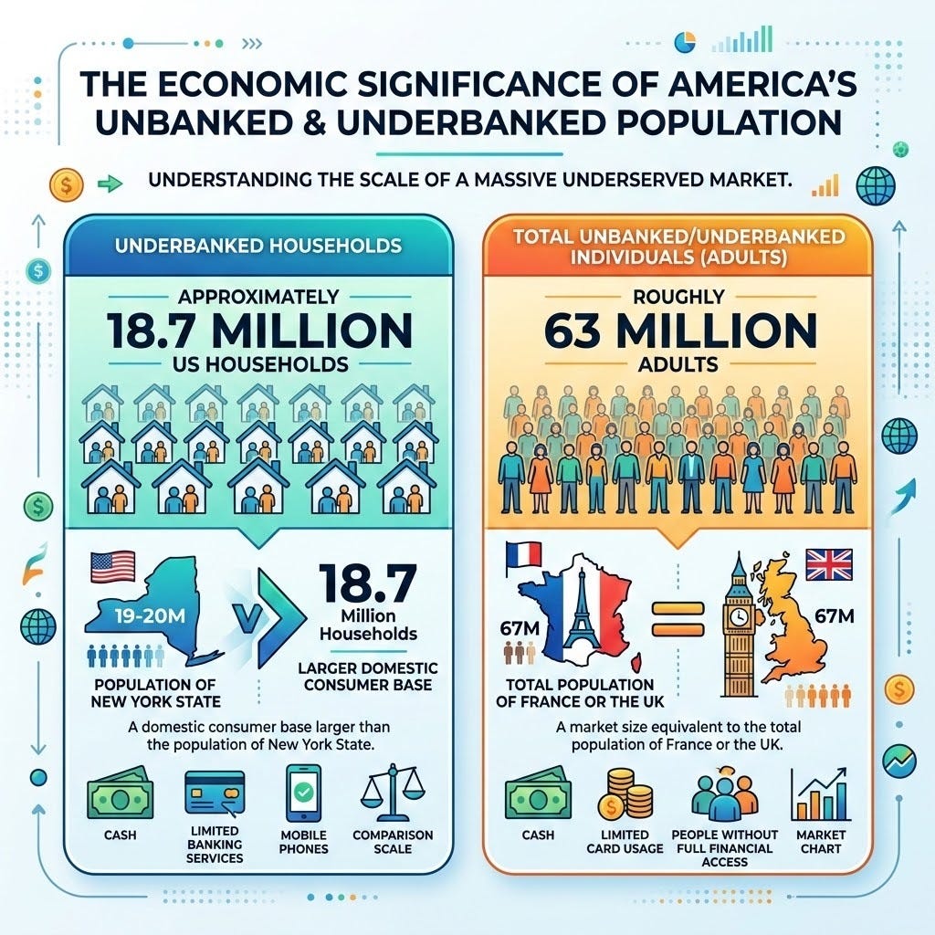 While attention is often paid to the 4.5% of US households that are completely unbanked (having no checking or savings account), the true scale of the market opportunity lies with the staggering 14.1% of US households that are underbanked. These are individuals who possess a bank account but are still forced to rely on high-cost, predatory alternative financial services (AFS) like payday loans, check-cashing outlets, money orders, and pawn shops to meet their most basic transactional needs.