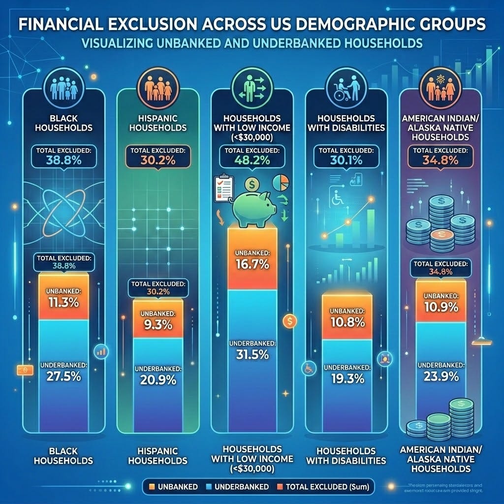 To successfully innovate for this market, we must understand the systemic roots of exclusion. The underbanked are disproportionately concentrated in certain demographic groups, underscoring that financial technology must address underlying issues of historical inequity, trust, and physical proximity.
